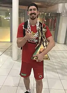 Hire's first game with the Rockingham Flames for the 2019 SBL season saw him record a triple-double with 18 points, 11 rebounds and 10 assists against the Cockburn Cougars.[54] In May 2019, he played in the same SBL game alongside former Wildcats teammates and fellow retirees Brad Robbins and Shawn Redhage when the Flames faced the Perry Lakes Hawks.[55] Later that month, he travelled with the Australian men's 3x3 team to compete in the 3x3 Asia Cup.[56] Hire thought his basketball career was over after retiring from the Wildcats, but 3x3 success opened new doors.[56] On 8 June 2019, he recorded 20 points, 18 rebounds and 10 assists in the Flames' 108–98 win over the Kalamunda Eastern Suns.[57] He helped the Flames finish the regular season in fourth place with an 18–8 record, and in the finals, they lost 2–0 to the Hawks in the quarter-finals. In 19 games, he averaged 17.47 points, 15.58 rebounds and 5.63 assists per game.[58] For the season, he was named to the SBL All-Star Five.[59]