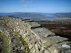 The Grianan of Aileach (/ˌɡriːnən əv ˈæljə(x)/ GREE-nən əv AL-yə(kh); Irish: Grianán Ailigh [ˌɟɾʲiənˠaːnˠ ˈalʲiː]), sometimes anglicised as Greenan Ely or Greenan Fort, is a hillfort atop the 244 metres (801 ft) high Greenan Mountain at Inishowen in County Donegal, Ireland. The main structure is a stone ringfort, thought to have been built by the Northern Uí Néill, in the sixth or seventh century CE;[1] although there is evidence that the site had been in use before the fort was built. It has been identified as the seat of the Kingdom of Ailech and one of the royal sites of Gaelic Ireland. The wall is about 4.5 metres (15 ft) thick and 5 metres (16 ft) high. Inside it has three terraces, which are linked by steps, and two long passages within it. Originally, there would have been buildings inside the ringfort. Just outside it are the remains of a well and a tumulus.