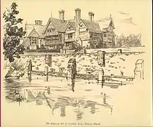 The house was designed in 1870 by Richard Norman Shaw for the Victorian era painter Frederick Goodall, who had purchased 110 acres (0.45 km2) of land[2] at Harrow Weald in 1856, but he did not begin to build until a lease on the property expired. Shaw's design for the house included aspects of Gothic revivalism, added to a late-Elizabethan style, which included high red-tiled gables, tall clustered chimneys and leaded lights. To the north of the house, Shaw built a small lodge, a walled garden and various outhouses and a stable block, later converted into garages by W. S. Gilbert for his collection of motorcars.[3] Over the dyke (now a duck pond) Shaw built two stone bridges, which incorporated flint from the ruined church at Stanmore.[4] Construction on the house was completed in 1872. Goodall's ground-floor studio was built on a north-south axis in order to catch the light. Goodall sold the property in 1880 to Robert Herriot of Hambros Bank, who added a billiard room in 1883.[5] Windsor Castle is visible from the house.[1]