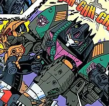 In the Japanese manga "Big War" #2, the Autobots Rodimus Prime, Grimlock, Kup and Wheelie, along with their human allies Spike Witwicky and Daniel Witwicky send Computron into battle against Galvatron's new warrior combiner Abominus. The Terrorcons spit "corrosive control liquid" against Computron, taking control of him and turning him into a Decepticon. Spike luckily uses his new Exosuit to free Computron with "defense spray". Defeated, Galvatron retreats.[14]