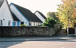 The Plough, opposite the station site, which acted as ticket office before the station was built. The footpath to the left, between two fences, follows the course of the dismantled line.