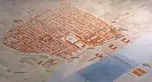 Great St Martin’s is located at the site of one of the original Rhine islands, situated east of the site of the Ancient Roman Praetorium. The island is no longer separate. When the site underneath the church was excavated in the years 1965-66, an investigation revealed that the earliest building dates from the first century,[15] and was 76 meters long and 71.5 meters wide. The inner room was 55.7 by 43.8 meters large, and held a mysterious shallow area used to store water, measuring 34 x 17.2 meters. This is notable because no similar structures from this period, North of the Alps have yet been found. Because no other information about the use of the building has been passed down, only conjectures can be offered as to the function of the pool. One possibility is that the building was used for recreation, and that the water storage area was a swimming pool. It is also possible that the pool was used to store live fish, to keep them fresh. A further theory posits that the site was a sacred Roman precinct or temple.[16]