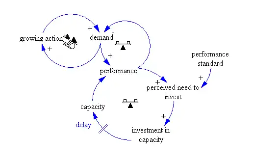 First, the growth of the slowing action causes growth of the perceived need for investment (e.g. building additional manufacturing capacity). Another factor that can positively contribute to the perceived need to invest is the failure to uphold the performance standard (for example manufacturing error rate). The perceived need to invest positively translates into actually making the investment. The investment made then negatively influences the slowing action (e.g. removal of capacity limits).