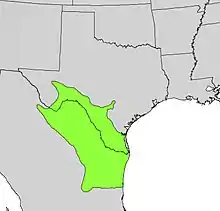 This tree can be found in the area around the Rio Grande, including Austin, Matagorda Bay, New Braunfels, San Antonio, Brownsville and Fort McIntosh westward to the Rio Pecos. In the 19th century trees growing along the outskirts of this region were so small they were described by the United States Department of Interior as "low shrub(s)". The largest examples could be found on the hillsides near the Guadalupe river valley.[5]
