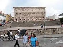 The War of Independence broke out in the state of Guanajuato in the town of Dolores, when Father Miguel Hidalgo y Costilla shouted the “Grito de Dolores” and raised an insurgent army on September 15 and 16, 1810. This army marched to San Miguel, today San Miguel de Allende, and then on to the city of Guanajuato. Just on the outskirts on September 28, 1810, Hidalgo sent a warning letter to city authorities, but it was ignored.[2] Instead, royalist troops and many of the elite made their stand at the Alhóndiga de Granaditas granary, an imposing building with few windows and thick walls. After entering the city unopposed, Hidalgo decided to attack the granary. This was the first battle against Spanish troops in the war and is popularly called the 'Siege of the Alhondiga'.[2][3] The insurgents were unable to take the heavily defended building as royalist gunfire kept them from approaching the only entrance until a miner by the name of Juan José de los Reyes Martínez, better known as El Pípila, brilliantly strapped a large flat stone onto his back for protection. Crawling, he carried a flask of tar and a torch. When he reached the wooden doors of the main entrance, he smeared it with the tar and set it on fire. This allowed the insurgents to penetrate the building, defeat the Spanish royalist army and elite, and take over the heavily fortified and defended building. This action is commemorated by a colossal statue of El Pípila on a hill overlooking the city.[14]