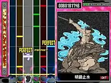 The interface is similar to other games in the Bemani series. Two note scrolls—one for each player—are displayed at the left and right sides of the screen. Colorful animations for each song are displayed in the center of the screen. Each note scroll consists of four columns: one each for the red, green, and blue buttons, and a fourth column, known as the Wailing Bonus column. Individual notes and chords are represented by small colored bars that scroll upward in the columns. To play the correct note, the player must hold down the buttons corresponding to the colored bars, and move the fret lever when the bars reach the yellow fretting line. When a guitar icon is displayed in the Wailing Bonus column along with an associated note, the player can tilt the guitar upright while playing the note to receive bonus points.