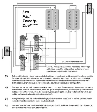 Guitar wiring refers to the electrical components, and interconnections thereof, inside an electric guitar (and, by extension, other electric instruments like the bass guitar or mandolin). It most commonly consists of pickups, potentiometers to adjust volume and tone, a switch to select between different pickups (if the instrument has more than one), and the output socket. There may be additional controls for specific functions; the most common of these are described below.