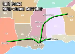 The Gulf Coast Corridor is one of ten federally designated high-speed rail corridors in the United States. The proposed corridor consists of three segments, each of which would carry trains capable of traveling at speeds of up to 110 mph: