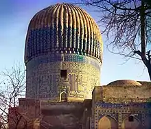 The Gūr-i Amīr or Guri Amir (Uzbek: Amir Temur maqbarasi, Go'ri Amir, Persian: گورِ امیر) is a mausoleum of the Turco-Mongol[1] conqueror Timur (also known as Tamerlane) in Samarkand, Uzbekistan. It occupies an important place in the history of Central Asian Architecture[2] as the precursor for and had influence on later Great Mughal architecture tombs, including Gardens of Babur in Kabul, Humayun's Tomb in Delhi and the Taj Mahal in Agra, built by Timur's Indian descendants, Turco-Mongols[3] that followed Indian culture with Central Asian influences,[4] and who successively married into the Hindu Rajput dynasties[5][6] of the Indian subcontinent and became Indianised[7] over time. Mughals established the ruling Mughal dynasty of the Indian subcontinent. The mausoleum has been heavily restored.