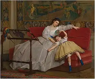 Gustave de Jonghe painted many scenes of mothers with their children (usually a daughter) in intimate settings. Through the choice of pose, clothing and setting de Jonghe characterized the type of person represented. The title of his paintings often hinted at the narrative of the picture, such as Going to the ball. His pictures aimed to evoke the quiet joys of family life among the prosperous bourgeoisie.[6]