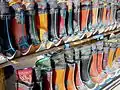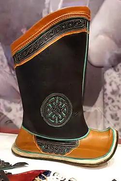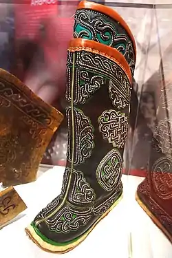 Mongol gutals or gutuls (singular: gutal, mong. гутал) are leather boots that are a traditional footwear of Mongolia. Some unique features of the boots include slightly upturned tip of the toes,[1] different varieties of leather ornaments[2] and vertically uneven cuts at the entering holes of the footwear. Gutals can be used especially as horseback riding[3] and wrestling footwear.[4] The left and the right boot are identical to each other,[5] which means that they aren't specifically meant for right- nor left-leaning leg.