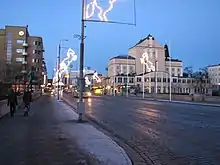 In June 2014 the eastern end of Hämeenkatu was changed to use public transport only[4] (although private car traffic was allowed for a short time from February to June 2017[5][6]). This experiment was in preparation for the construction of the Tampere light rail starting in 2017, where Hämeenkatu was fully converted for use of public transport only, and only light traffic, trams, buses, taxis and service traffic are allowed on it. The light rail traffic will start in 2021.