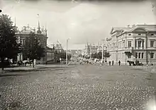 There originally was an old travel route in the village of Tammerkoski in the locality of Messukylä, located at the place of present-day Tampere, whose route approximately corresponded to the present-day Hämeenkatu. Slightly to the north of the Hämeensilta bridge, at the shallowest point of the rapids, was an ancient crossing point, later the first bridge across Tammerkoski.[1] When Tampere was founded in 1779, the present-day Hämeenkatu was part of the city plan, but the original main street of Tampere was Kauppiaskatu (later known as Kauppakatu), ending at an old wooden bridge in the east. The street Raatihuoneen Poikkikatu, located at the place of present-day Hämeenkatu, was narrower than Hämeenkatu and did not have a bridge.[2] The wooden bridge was renovated many times and the last wooden bridge was built in 1848.[3]