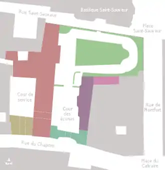 The hôtel de Blossac is located in the northwest in the secteur sauvegardé (protected area) of the historic city center. Its address and the main entrance, a porch, are at 6, rue du Chapitre. It is surrounded by rue de Montfort Street (at the east) and on the rue Saint-Sauveur (at the north). Two doors, one condemned and the other for use by staff, are arranged in the garden wall.[N 1] The western part (hôtel and service yard) is adjacent to other buildings or courses leading to deprivation. The hôtel garden offers views of Blossac the south side of the basilica of the Saint Sauveur, whereas since the floors of the hôtel it is possible to see, at the west, the nearby Rennes Cathedral.