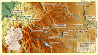 Further on, between Neustadt and Donaueschingen, the viaduct at the former Kappel Gutachbrücke station crosses the Wutach at the beginning of its long gorge. While in a 535-metre (1,755 ft) tunnel near Döggingen station, the line crosses a main European watershed, between the Rhine drainage basin (flowing into the North Sea) and the Danube drainage basin (flowing into the Black Sea).
