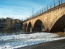 Begna Railway Bridge is a 216-metre-long (709 ft) bridge that runs over the Ådal River (lower part of Begna) at Hønefoss Station, directly above the Hønefoss water falls. The bridge was built in 1898, adopted at the same time that it was decided that the Bergen Line would go to Hønefoss.