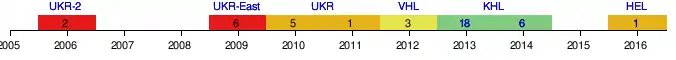 HC Donbass is six times Ukrainian champion (2011, 2012, 2013, 2016, 2017, 2018). The team was a member of the Kontinental Hockey League (KHL) during the 2012–13 and 2013–14 seasons,[1] and was the sole representative from Ukraine competing at the elite international level. Due to the War in Donbas, the team did not compete in the 2014–15 KHL season.