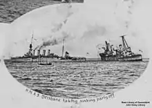 The Australian invasion force had mustered off the Louisiade Archipelago by 9 September; the assembled ships included Australia, the cruisers Sydney, and Encounter, the destroyers Parramatta, Warrego, and Yarra, the submarines AE1 and AE2, the auxiliary cruiser HMAS Berrima, the storeship SS Aorangi, three colliers and an oiler.[63] The force sailed north, and at 06:00 on 11 September, Australia deployed two picket boats to secure Karavia Bay for the expeditionary force's transports and supply ships.[64] Later that day, Australia captured the German steamer Sumatra off Cape Tawui.[57][65] After this, the battlecruiser stood off, in case she was required to shell one of the two wireless stations the occupation force was attempting to capture.[66] The German colony was captured, and on 15 September, Australia departed for Sydney.[67]