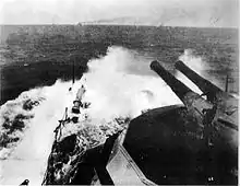 The ship had a main armament of 25-calibre rifled breech-loading (BL) 12-inch (305 mm) Mk II guns. The four guns were mounted in two twin-gun barbettes, one forward and one aft of the superstructure. The barbettes were open, without hoods or gun shields, and the guns, mounted on a turntable, were fully exposed. They could only be loaded when pointed fore and aft with an elevation of 13°. The 714-pound (324 kg) shells fired by these guns were credited with the ability to penetrate 20.6 inches (523 mm) of wrought iron at 1,000 yards (910 m),[10] using a charge of 295 pounds (134 kg) of prismatic brown powder. At maximum elevation, the guns had a range of around 9,400 yards (8,600 m).[11]