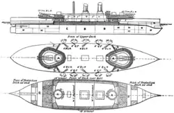 At the time of her design, she was not considered as being the forerunner of any class; she was designed by the Director of Naval Construction, Sir Nathaniel Barnaby, as a one-off as an answer to the French Amiral Baudin-class ironclads, which carried three heavy guns on the centreline and a number of smaller pieces on the broadside. He made several proposals to the Board of Admiralty, but they were all rejected.[1] Barnaby's final submission was inspired by the four French Terrible-class ironclads laid down in 1877–1878 and was a return to the configuration of Devastation with the primary armament positioned fore and aft of the central superstructure, but with the breech-loading main armament mounted in barbettes, as per the French ships,[2][3] which allowed them to be sited 10 feet (3.0 m) further above the waterline than Devastation's guns.[4] The Board modified Barnaby's design by adding 25 feet (7.6 m) of length and 2,000 indicated horsepower (1,500 kW) to guarantee a speed of 15 knots (28 km/h; 17 mph) at deep load. It also substituted four smaller 42-long-ton (43 t) guns for Barnaby's two 80-long-ton (81 t) guns. The additional length and the Board's acceptance of the hull lines from Colossus increased the size of the ship by 2,500 long tons (2,540 t).[5]