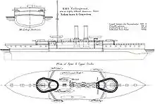 Each barbette was a roughly pear-shaped, 11-sided polygon, 60 by 45 feet (18.3 m × 13.7 m) in size with sloping walls 11.5 inches (292 mm) thick and a 10-inch (254 mm) rear. The main ammunition hoists were protected by armoured tubes with walls 10–12 inches thick.[4] The conning tower also had 12-inch thick walls as well as roofs 2 inches (51 mm) thick. The deck of the central armoured citadel had a thickness of 3 inches (76 mm) and the lower deck was 2–2.5 inches (51–64 mm) thick from the ends of the belt to the bow and stern.[4][9]