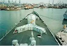 This location proved to be an unsuitably wet one for the Phalanx system despite the modifications to this warship, and Edinburgh was later fitted with a pair of wing-mounted CIWS as carried by the other ships of the class, but she retained her distinctive bulwark and enlarged breakwaters.