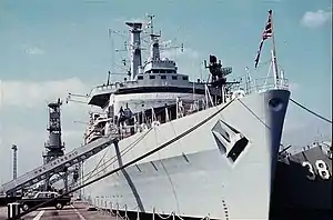 In November 1967, Intrepid formed part of a naval task force deployed to cover the British Withdrawal from Aden.[4] On 29 March 1968, Intrepid and the frigate Tartar were deployed to patrol off the Greater and Lesser Tunbs, small islands in the Persian Gulf, to deter Iran from occupying the islands.[5] Intrepid became the first Royal Navy warship equipped with satellite communication equipment in 1969.[1]