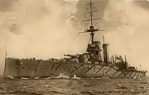 A fire-control director was installed on the roof of the spotting top in 1914, before the start of the war in August; her original pole foremast was reinforced by flanged girders to stiffen it and allow it to bear the weight of the director.[6] By October 1914, a pair of 3-inch (76 mm) anti-aircraft (AA) guns had been added.[7] The torpedo nets were removed in 1915–1916. Approximately 80 long tons (81 t) of additional deck armour was added after the Battle of Jutland and a medium-length rangefinder was added atop the conning tower. Around the same time, the ship was modified to use a kite balloon. By April 1917, the 4-inch guns had been removed from the hull casemates as they were frequently unusable in heavy seas. The casemates were plated over and some of the compartments were used for accommodations. That same year, the spotting top was enlarged and the foremast was fitted with full-sized tripod legs to handle the additional weight. Her stern torpedo tube was removed in 1917–1918 and flying-off platforms were fitted on the roofs of 'B' and 'Q' turrets during 1918.[8]