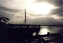 The ship entered refit at Devonport in October 2014, was due to rejoin the Fleet in 2016, but the incomplete installation of the Sea Ceptor Missile system and a new command system prevented it.[24] Ship's staff moved back on board in March 2017 to prepare for sea trials and it was announced that Montrose would escort HMS Queen Elizabeth on her deployment to the United States for first of class flying trials in 2018.[25] Montrose returned to sea for the first time in nearly three years on 7 July 2017 to commence a period of trials and testing before undergoing operational sea training later in the year.[26] Despite the announcement in 2017, Montrose did not accompany Queen Elizabeth on her 2018 deployment; escort duties instead fell to sister HMS Monmouth.[27] Montrose instead began working up for a major three-year deployment, which would see the ship become the first frigate to be based at the Royal Navy's new support facility in Bahrain, HMS Juffair.