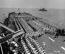 Ocean was laid down at Alexander Stephen & Sons Glasgow shipyard on 8 November 1942 and was launched on 8 July 1944.[5] In March 1944, a proposal was made by the Australian government to purchase a light fleet carrier, specifically Ocean.[6] The application was rejected in early June 1945, and the carrier entered Royal Navy service.[6] The ship was commissioned on 8 August 1945.[5] In total, the ship required 20772 man-months to build.[7][8]