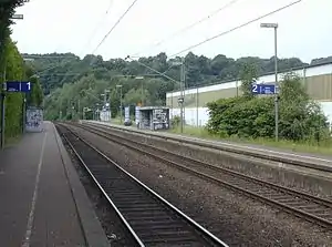 Hagen-Heubing station is a through station in the city of Hagen in the German state of North Rhine-Westphalia. The station was opened along with a section of the Düsseldorf-Derendorf–Dortmund Süd railway, opened by the Rhenish Railway Company (German: Rheinische Eisenbahn-Gesellschaft, RhE) between Wuppertal-Wichlinghausen and Hagen RhE station (now Hagen-Eckesey depot) on 15 September 1879. It was closed on 14 May 1950, but reopened in 1968.[5] It has two platform tracks and it is classified by Deutsche Bahn as a category 6 station.[1]