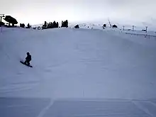 For winter sports such as freestyle skiing and snowboarding, a half-pipe can be dug out of the ground or snow perhaps combined with snow buildup. The plane of the transition is oriented downhill at a slight grade to allow riders to use gravity to develop speed and facilitate drainage of melt. In the absence of snow, dug out half-pipes can be used by dirt-boarders, motorcyclists, and mountain bikers.