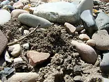 Stones or areas of vegetation are usually found near nest entrances, likely because of the heating properties of these objects.[12] For each offspring, a females constructs a small underground chamber (a "brood cell"), into which she deposits several loads of pollen mixed with nectar, which is then formed into a ball; a single egg is laid upon this pollen mass, and then the brood cell is sealed. The female repeats the process with other brood cells, going progressively deeper into the soil.[5] A higher temperature increases the rate at which the larvae develop to maturity, as thermal regulation is important for the development of both the eggs and the larvae.[13]