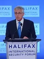 The Halifax Forum is attended by international government and military officials, academic experts, authors and entrepreneurs.[165][166][167][168] Prominent political participants include Ministers, Senators and Members of Parliament. The ministers included John Baird, Steven Blaney, Scott Brison, Kent Hehr, Peter MacKay, Rob Nicholson, Harjit Sajjan, and Vic Toews from Canada, as well as Chuck Hagel, Robert Gates, Leon Panetta, and Janet Napolitano from the United States. From Europe the ministers Michael Fallon from the United Kingdom, Karl-Theodor zu Guttenberg from Germany, Pieter De Crem from Belgium, Jeanine Hennis-Plasschaert from the Netherlands, Jean-Yves Le Drian from France,[169] Pedro Morenés from Spain, Guy Parmelin from Switzerland,[27] Milica Pejanović Đurišić from Montenegro, Hannes Hanso,[170] Nikola Poposki and Zoran Jolevski from Macedonia, Gunnar Bragi Sveinsson from Iceland, Nicolai Wammen from Denmark, Haki Demolli from Kosovo, Tina Khidasheli from Georgia, Mimi Kodheli from Albania, Juozas Olekas from Lithuania, and Jüri Luik from Estonia[171] are among previous Halifax Forum participants. Also, ministers Ehud Barak and Moshe Ya'alon from Israel, Juan Carlos Pinzón Bueno and Luis Carlos Villegas from Colombia, Salvador Cienfuegos Zepeda from Mexico,[27] Rodrigo Hinzpeter from Chile, Wayne Mapp from New Zealand, Abdul Rahim Wardak from Afghanistan and Delfin Lorenzana from Philippines[27] attended the forum.