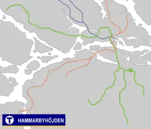 Hammarbyhöjden metro station is on the green line of the Stockholm metro, located in Hammarbyhöjden, Söderort. The station was inaugurated on 17 April 1958 as the east terminus of a one-station extension from Skärmarbrink. On 18 November 1958 an extension to Bagarmossen was opened.[2] The distance to Slussen is 3.8 km (2.4 mi).