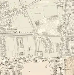 Hammersmith station was opened on 8 April 1858 by the North & South Western Junction Railway (N&SWJR) on the site of a goods yard, which had opened on 1 May 1857, on Chiswick High Road in what was then a rural area.[2] The station was at the end of a 1.5 mile (2.5 km) branch line which ran northward from the North London Railway (NLR) line at South Acton and turned sharply to run south into Hammersmith & Chiswick.