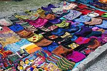 Textile designs in Chiapas are very similar to those of Guatemala, as they come from the same origin.[8] Most of the designs are in strong colors such as red, yellow, turquoise blue, white, purple, pink and deep green but some pastels are also combined with these. Motifs include flowers, butterflies and rainforest birds.[1] The growth of handcraft production has meant diversification in designs and products, especially in textiles, both in weaving and embroidery.[3] Synthetic fibers are making their way into pieces, either used to make the cloth or added as embroidery.[8] Embroidery designs can come from more common inspiration. For example, many of the textiles of Aguacatenango have four-petaled flowers mimicking those on the facade of the San Agustin Church, which dates from the 17th century.[3]
