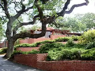 Begun in 1937 and expanded over 25 years, this is the first and best example of Wright's innovative hexagonal design.[2] A Usonian home patterned after the honeycomb of a bee, the 3,570 square foot house incorporates six-sided figures with 120-degree angles in its plan, in its numerous tiled terraces, and even in built-in furnishings. In American National Bibliography Frederick Ivor-Campbell wrote "(the) Honeycomb House showed how Wright's system of Polygonal modules could provide the openness that he associated with freedom of movement while gracefully integrating the house with its sloping topography. The hexagonal modules of the floor plan gave the appearance of a honeycomb; hence the name of the house."[3] There are no right angles on the floor plan.[5]