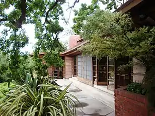 The house is one-story high with a central clerestory (an outside wall of a room or building that rises above an adjoining roof and contains windows) and is constructed of native redwood board[5] and batten, San Jose brick, concrete and plate glass. The house clings to and completes the hillside on which it was built as the floor and courtyard levels conform to the slope of this one and one-half acre site. The entire site includes the main house, a guesthouse, hobby shop, storage building, double carport, breezeway, and garden house with pools and water cascade. After living in the house for 38 years, the Hannas gave the property to Stanford University in 1974.