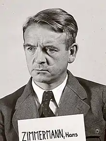 Zimmermann joined the Nazi Party on 11 November 1930 (membership number 377,977[2]) and the Sturmabteilung (SA) at the same time. In Nuremberg, Zimmermann functioned from January 1931 through June 1933 as a Party leader in the St. Johannis section of the city, then as an Ortsgruppenleiter (Local Group Leader) and from 16 July 1934 as a Kreisleiter (County Leader). On 27 June 1933, he became managing director of the Allgemeine Ortskrankenkasse (AOK) a medical insurance company in Nuremberg, and from May 1939 to May 1945 he was the Director of the National Federation of Local Health Insurers. From May 1933 to 1935, he worked in the City Council (Stadtsrat) of Nuremberg and from 1 October 1935 until May 1945 he was a City Councilor (Ratsherr).[1]