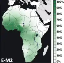 Haplogroup E-M2 is a human Y-chromosome DNA haplogroup. It is primarily distributed in sub-Saharan Africa. E-M2 is the predominant subclade in Western Africa, Central Africa, Southern Africa and the African Great Lakes, and occurs at moderate frequencies in North Africa and Middle East. E-M2 has several subclades, but many of these subhaplogroups are included in either E-L485 or E-U175. E-M2 is especially common in native Africans speaking Niger-Congo languages and was spread to Southern and Eastern Africa through the Bantu expansion.