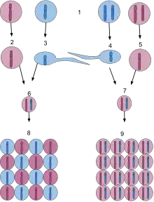 4 and 5) Diploid sperm and egg carrying the recessive blue gene and the dominant purple gene, respectively. These gametes are produced by meiosis, which halves the number of chromosomes in the diploid germ cells.