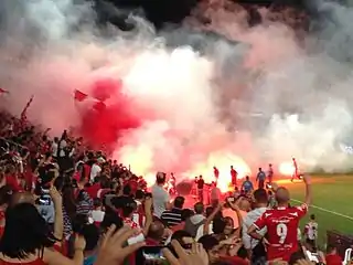 Ultras Hapoel often wave flags emblazoned with the faces of Che Guevara and Karl Marx, as well as banners with the slogan "Workers of the world, unite!".[11] The club ultras has friendships with many other antifa supporter groups, including strong bonds with fans of FC St. Pauli, Standard Liège, Omonia Nicosia, and Celtic F.C.[7][8][9][10]