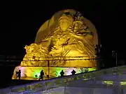 Swing saws are used to carve ice into blocks, taken from the frozen surface of the Songhua River.[10] Chisels, ice picks and various types of saws are then used by ice sculptors to carve out large scaled ice sculptures,[11] many of them intricately designed[10] and worked on all day and night prior to the commencement of the festival. Deionised water can also be used, producing ice blocks as transparent as glass to make clear sculptures rather than translucent ones.[12] Multicoloured lights[13] are also used to give colour to ice, creating variations on sculptured spectacles when lit up especially at night. Some ice sculptures made in previous years include: buildings and monuments of different architectural types and styles, figures including animals people and mythical creatures, slippery dips or ice slides and lanterns.[14][15] Apart from winter recreational activities available in Harbin, these exquisitely detailed, mass-produced ice sculptures are the main draw card in attracting tourists around the world to the festival.[13]