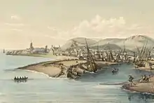A harbor (American English), harbour (British English; see spelling differences), or haven is a sheltered body of water where ships, boats, and barges can be docked. The term harbor is often used interchangeably with port, which is a man-made facility built for loading and unloading vessels and dropping off and picking up passengers. Ports usually include one or more harbors. Alexandria Port in Egypt is an example of a port with two harbors.