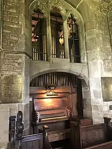The organ in Harby parish church as listed on the National Pipe Organ Register.[10] Was initially built by Thomas Elliot and installed at Gedling Parish Church, Nottinghamshire by Elliot's foreman Alexander Buckingham in 1808. The organ was probably built at Elliot's works in Tottenham Court Road, London with his business partner John Nutt. It was removed from Gedling at a cost of more than £80 and transported to Harby in 1874, where it was first installed at an additional cost of £11 in the northeast corner of the north aisle, where the font stands now. When a new vestry was built in 1903, the organ was moved to face north into the chancel choir.