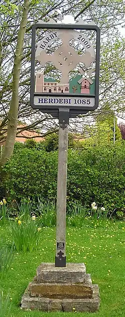 Old names for the village include Hereby, Herdby, Hedeby, and Harteby. The first element "Har" either derives from the old Scandinavian "hiorth" meaning herd, flock, or the old Norse personal name "Herrothr", found in old Danish as "Heroth". The second element is the old Scandinavian "by", meaning a village or homestead.[2]