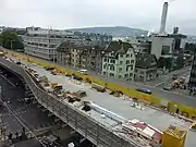 The Hardbrücke is a road bridge and important north-south connection in the Swiss city of Zürich. The bridge is 1,350 metres (4,430 ft) long, and crosses the river Limmat, the Zürich–Baden railway, and several streets. In crossing the river, the Hardbrücke forms an upper level to the lower level Wipkingerbrücke road bridge. Between the river and rail crossings, several exit and entrance ramps link the bridge to the streets below.
