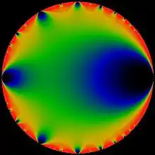 It is the case, as the false-colour diagram indicates, that for a theta function the 'most important' point on the boundary circle is at z = 1; followed by z = 1, and then the two complex cube roots of unity at 7 o'clock and 11 o'clock. After that it is the fourth roots of unity i and i that matter most. While nothing in this guarantees that the analytical method will work, it does explain the rationale of using a Farey series-type criterion on roots of unity.