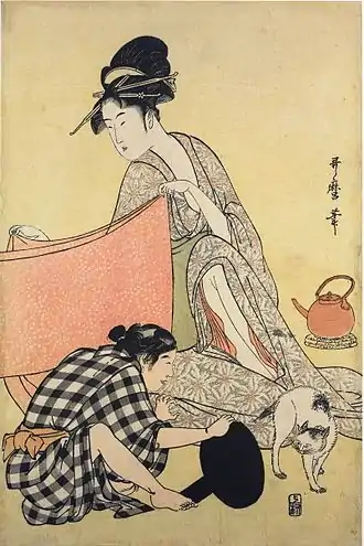 Ukiyo-e art flourished in Japan during the Edo period from the 17th to 19th centuries, and took as its primary subjects courtesans, kabuki actors, and others associated with the "floating world" lifestyle of the pleasure districts. Alongside paintings, mass-produced woodblock prints were a major form of the genre.[1] In the mid-18th century full-colour nishiki-e prints became common, printed using a large number of woodblocks, one for each colour.[2] A prominent genre was bijin-ga ("pictures of beauties"), which depicted most often courtesans and geisha at leisure, and promoted the entertainments of the pleasure districts.[3]
